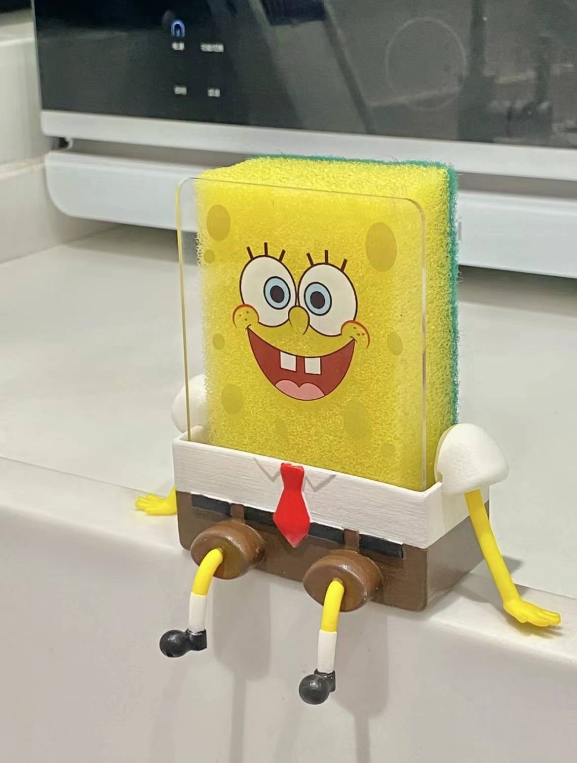 用躯壳当底座,前边竖一块神采板,这么一来,哪怕是普通的洗碗棉放上去,都是一个可人的海绵宝宝。