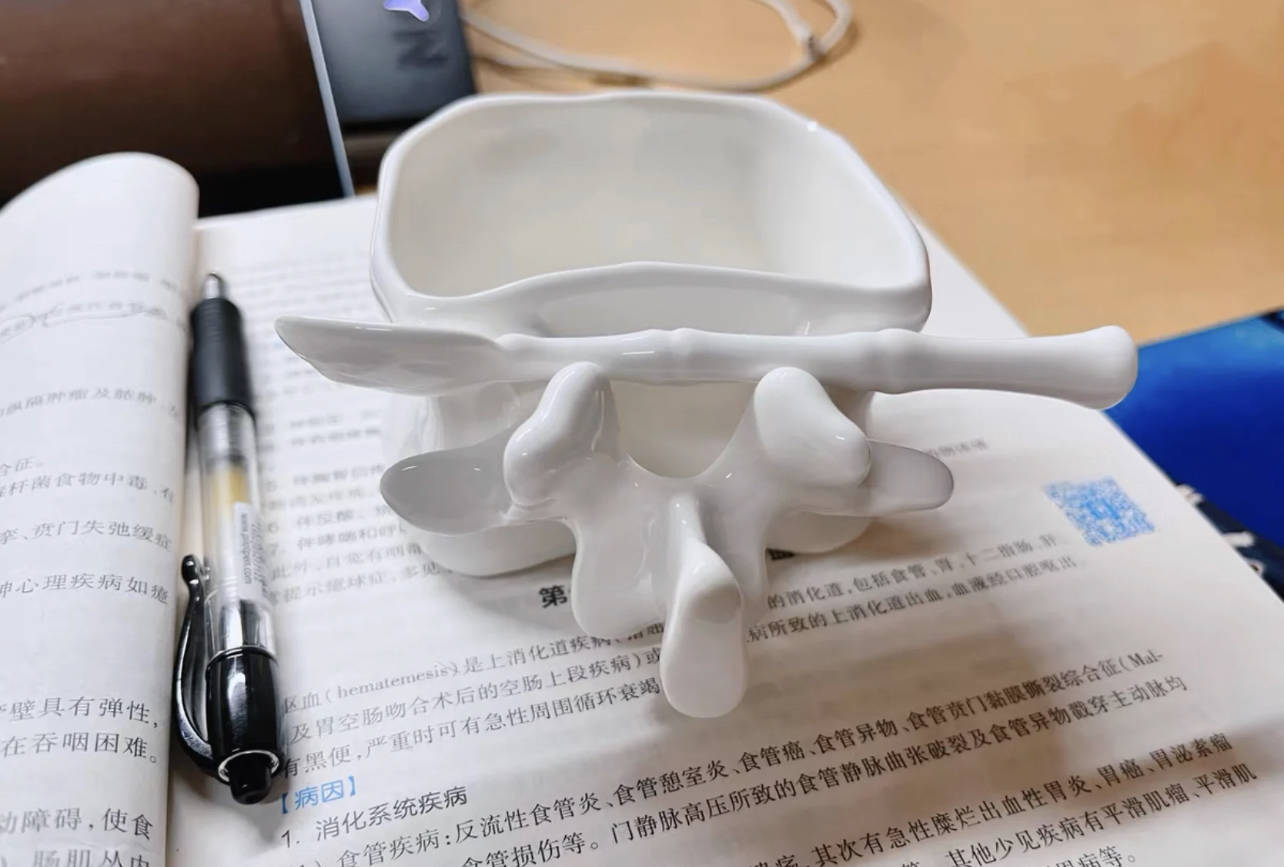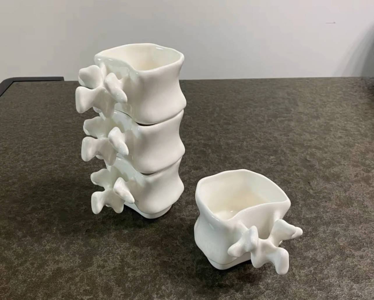 一个个造型奇特的杯子,摞在一皆会组合成一个完整的脊柱,照旧那种不带转折、不带凸出的齐备脊柱。