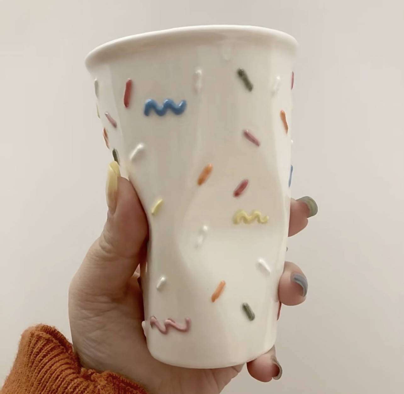 实则是陶瓷材质的,也不知说念佛营师是不是真有捏扁纸杯的履历,才运筹帷幄出来的这个杯子。