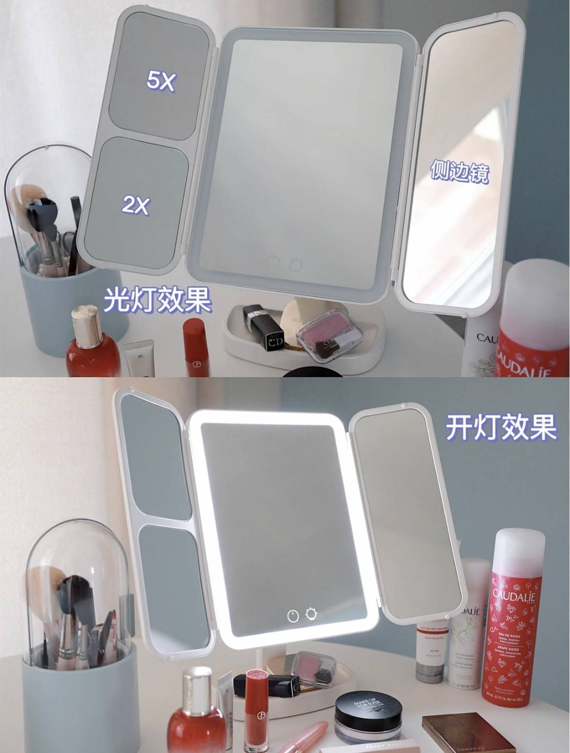 这种三折的化妆镜,不光是能照正面,还能照侧面,化妆时,不光是正面要好意思,侧面颜值咱也能兼顾。