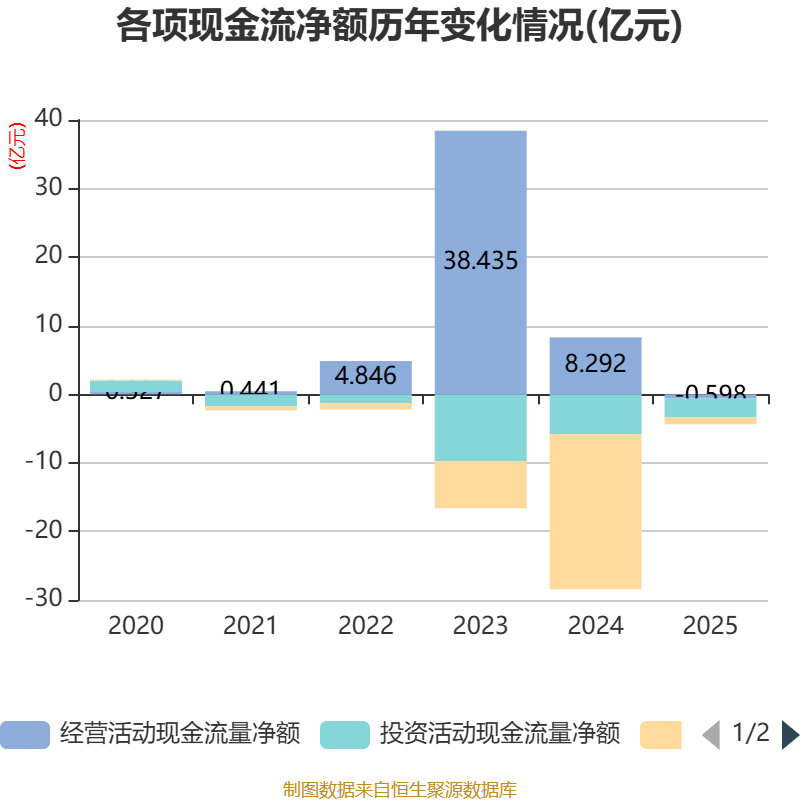 按捺2025年,公司筹谋当作现款流净额为-5983.5万元,同比减少8.89亿元;筹资当作现款流净额-1.02亿元,同比增多21.59亿元;投资当作现款流净额-2.75亿元,上年同时为-5.81亿元。