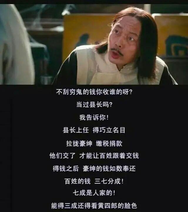 “县长上任,得巧立方法,拉拢豪绅,缴税捐钱。他们交了,能力让庶民随着交钱。得钱之后,豪绅的钱如数奉还,庶民的钱三七分红。”