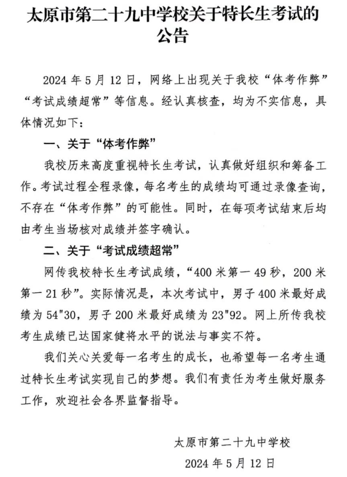 12日晚,太原市第二十九中学校就此发布公告称,集聚上出现对于该校“体考舞弊”“检修得益超常”等信息。经谨慎核查,均为作假信息。检修流程全程摄像,每名考生的得益均可通过摄像查询,不存在“体考舞弊”的可能性。