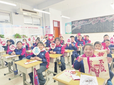 近日,在五莲县汪湖镇中心小学,孩子们正向记者展示全心创作的“哪吒”主题系列剪纸作品。
