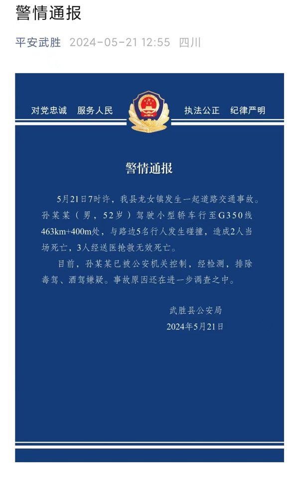 随后,武胜县公安局发布警情通报:5月21日7时许,我县龙女镇发生一齐谈路交通事故。孙某某(男欧洲杯体育,52岁)驾驶微型轿车行至G350线463km+400m处,与路边5名行东谈主发生碰撞,形成2东谈主赶紧归天,3东谈主经送医抢救无效归天。当今,孙某某已被公安机关截止,经检测,摒除毒驾、酒驾嫌疑。事故原因还在进一步看望之中。