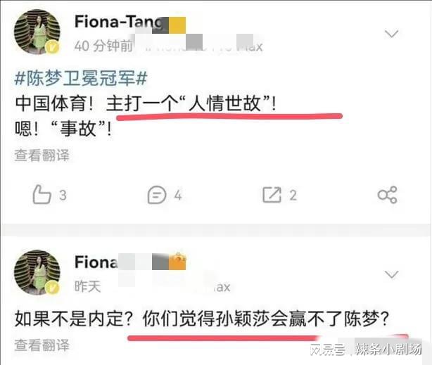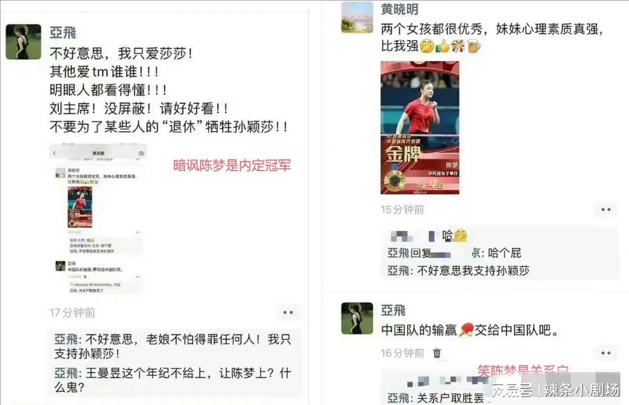 此前,陈梦刚夺冠时她在一又友圈发文暗示,陈梦是内定的,莎莎是“阵一火品”,黄晓明当今两个女孩儿皆很优秀,她不才面留言“不好道理我援手孙颖莎”。