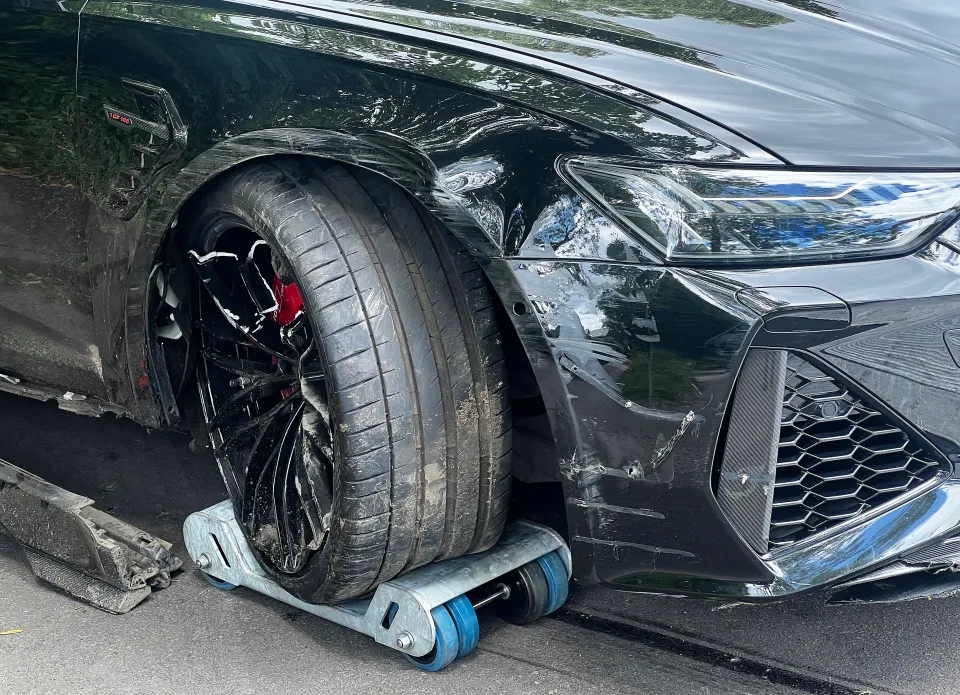 图片露出,这辆价值22万英镑的奥迪的副驾驶前翼被严重刮伤。副驾驶一侧的前轮似乎也受到了损坏,其后有东谈主看到这辆车被拖车拖走。